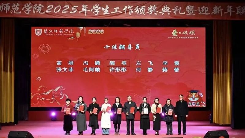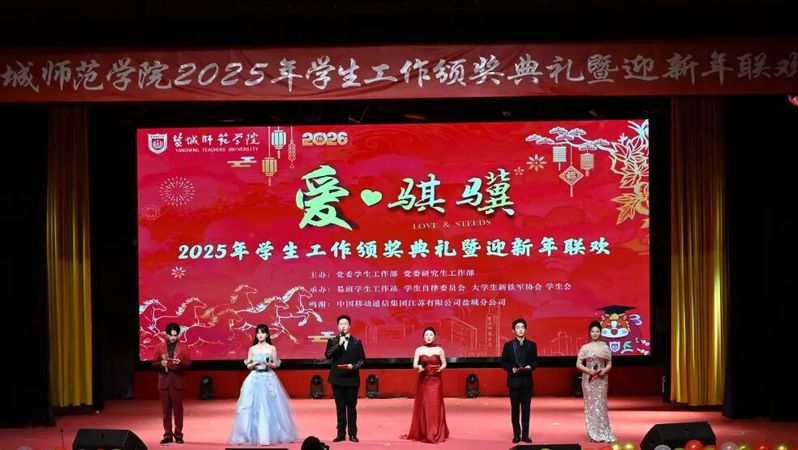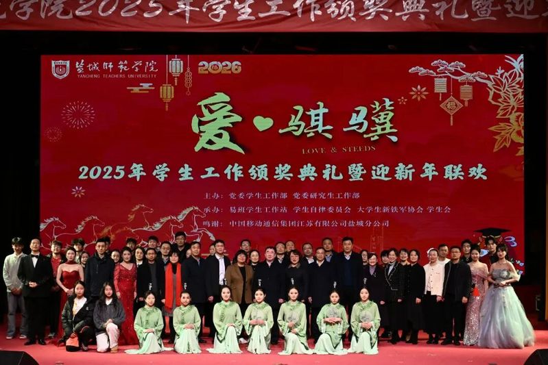 12月31日下午,新长校区大学生活动中心流光溢彩、暖意融融,以“爱・骐骥”为主题的2025年学生工作颁奖典礼暨迎新年联欢在此隆重举行。校党委书记张玉勤,校党委常委、副校长韩雅丽,校原党委常委、副校长、现任学校关工委副主任庞波,校党委常委、党委宣传部部长冯永玲,校党委常委、党委统战部部长费正皓,校党委常委、党委组织部部长丁炫凯,学工委成员单位负责人、校友办、工会负责人,各二级学院党政负责人,辅导员、班主任、学生代表以及盐城移动公司的嘉宾等400余人欢聚一堂,共话育人成果,共贺新年新禧,共启2026年奋进新程。