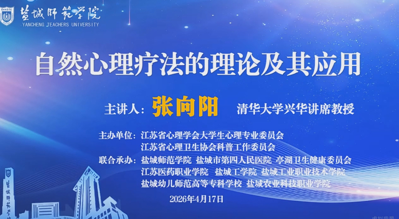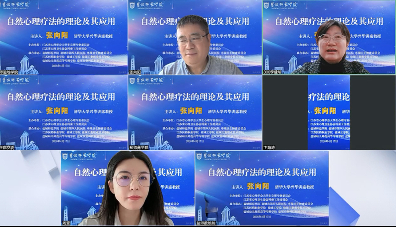 4月17日下午,由江苏省心理学会大学生心理专业委员会、江苏省心理卫生协会科普工作委员会主办,驻盐高校学工部门联合地方精神专科医院及卫健部门共同承办的“自然心理疗法”线上专题培训顺利举行。培训特邀清华大学兴华讲席教授、博士生导师、中国科学院“百人计划”入选者、自然心理疗法创立者张向阳教授担任主讲。活动由盐城师范学院党委学工部部长、研工部部长、学生工作处处长李健明主持,驻盐高校辅导员、心理健康教育教师及盐城地方临床心理工作者1000余人齐聚云端参训。
